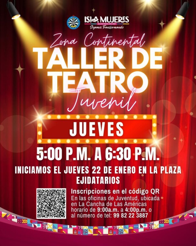 En Isla Mujeres se ofrece el Taller de Teatro Juvenil, el cual se imparte los miércoles y viernes de 19:00 a 20:00 horas en las oficinas de la Dirección de Juventud, ubicadas a un costado del domo de la colonia La Gloria.