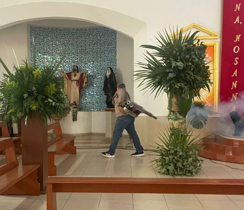 Como parte de las acciones permanentes para proteger la salud de las familias isleñas y de quienes visitan el municipio durante la temporada vacacional, el Gobierno de Isla Mujeres, que encabeza la Presidenta Municipal Atenea Gómez Ricalde, en coordinación con la Secretaría de Salud de Quintana Roo y el área de Vectores de la Jurisdicción Sanitaria No. 2, llevó a cabo una jornada de termonebulización en parroquias y capillas del municipio, previo al inicio de la Semana Santa.