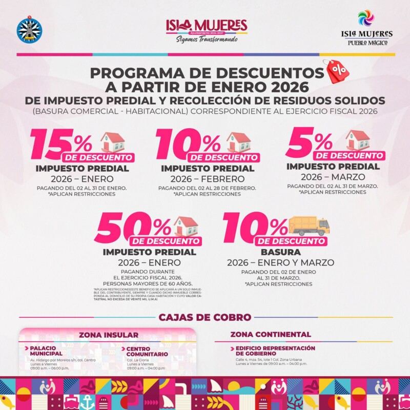 Con el objetivo de apoyar la economía familiar y reconocer el esfuerzo de las y los contribuyentes, el Gobierno de Isla Mujeres, que encabeza la Presidenta Municipal, Atenea Gómez Ricalde, informa a la ciudadanía que a partir del próximo 2 de enero de 2026 estará vigente el Programa de Descuentos en el pago del Impuesto Predial y del servicio de Recolección de Residuos Sólidos.