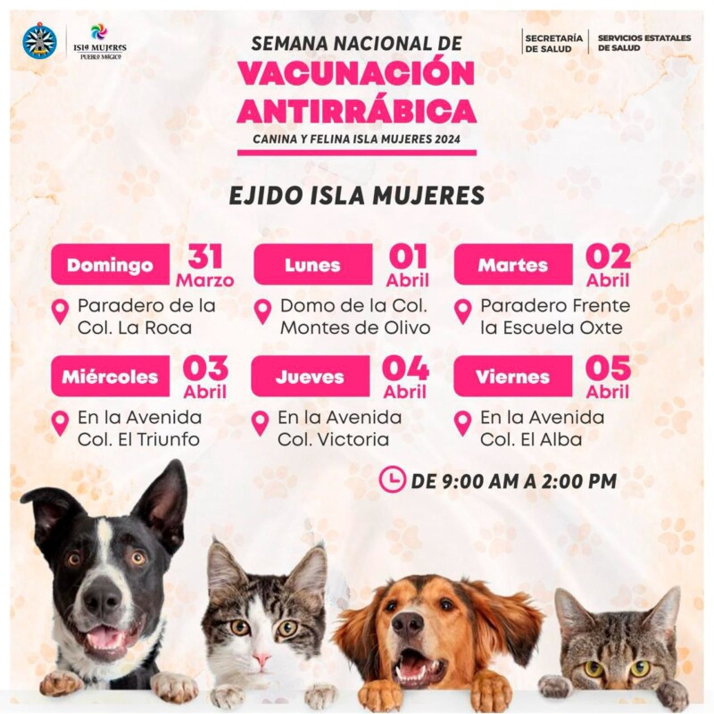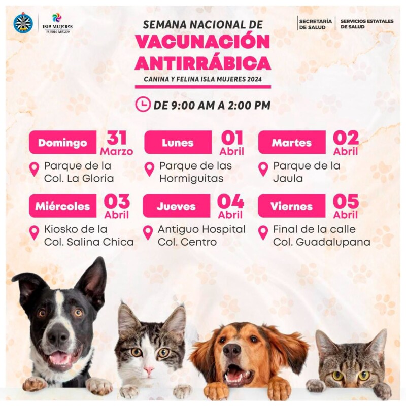 A partir de el pasado domingo 31 de marzo, inició en Isla Mujeres la Semana Nacional de Vacunación Antirrábica Canina y Felina, organizada por la Secretaría de Salud Federal en colaboración con los Servicios Estatales de Salud (Sesa) y la Dirección Municipal de Salud.