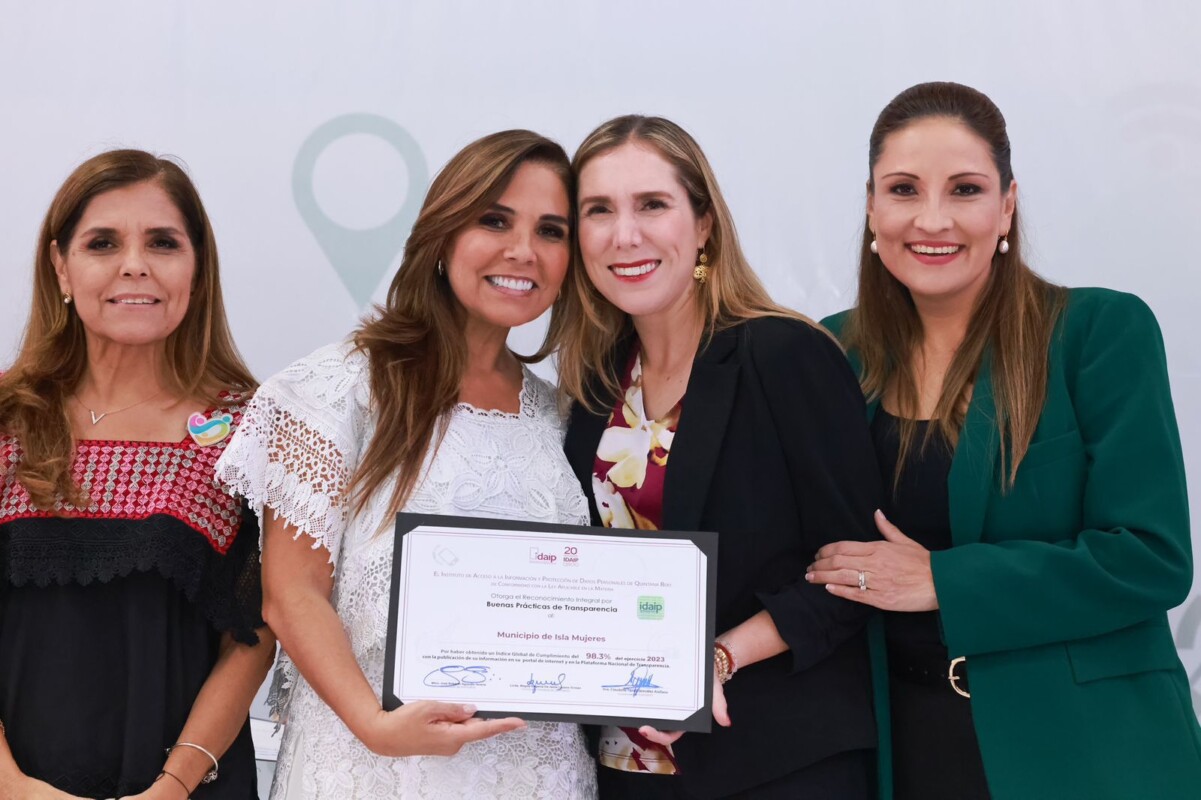Isla Mujeres.- Gracias a las buenas prácticas implementadas en esta administración, el Gobierno Municipal de Isla Mujeres, que encabeza la alcaldesa Atenea Gómez Ricalde, recibió del Instituto de Acceso a la Información y Protección de Datos Personales de Quintana Roo (Idaipqroo), un reconocimiento de cumplimiento, al destacar entre los tres primeros lugares, con un 98.3% en el Ejercicio 2023.