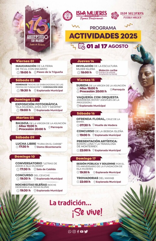 El domingo 3 de agosto, también en la Explanada Municipal, se inaugurará la exposición fotográfica “Isla Mujeres, ayer, hoy y siempre”, una muestra visual que retrata cómo ha evolucionado el municipio a lo largo de su historia. Esta actividad dará inicio a las 7 de la noche y estará abierta al público de forma gratuita.