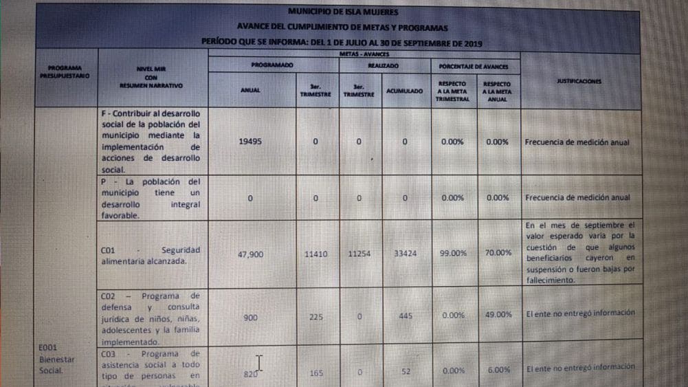 Opaco gobierno presenta Juan Carrillo.- l Ayuntamiento de Isla Mujeres, que encabeza Juan Carrillo Soberanis, presenta un lento avance del cumplimiento de los programas de acuerdo al Análisis del Informe de Avance de Gestión Financiera en lo que corresponde al tercer trimestre de julio a – septiembre del 2019.