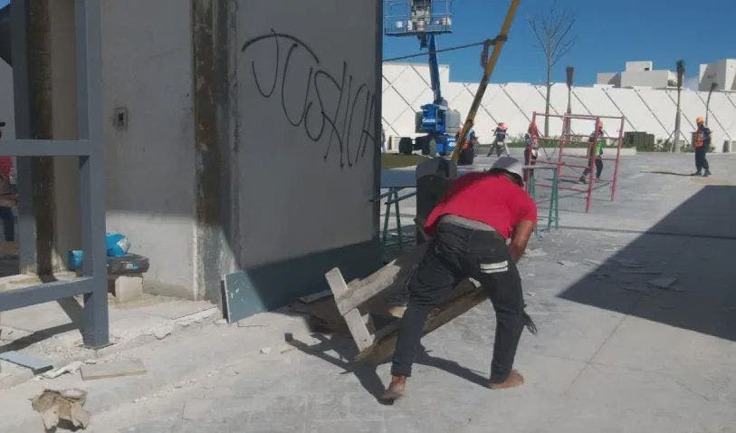 En los primeros momentos de la manifestación, todo era relativamente pacifico, se limitaron a colocar algunos carteles con consignas y fotos de los albañiles asesinados, pero las cosas cambiaron cuando una mujer comenzó a pintar las paredes y causar algunos destrozos.