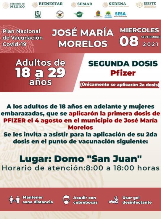 Aplicarán en JMM segunda dosis de Pfizer y Sinovac para 18 a 29 años. El próximo lunes 6 de septiembre dará inicio la campaña de vacunación para la aplicación de segunda dosis contra el Covid-19 de Pfizer y Sinovac en el domo de San Juan del municipio de José María Morelos.