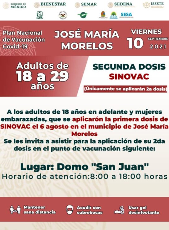 Aplicarán en JMM segunda dosis de Pfizer y Sinovac para 18 a 29 años. El próximo lunes 6 de septiembre dará inicio la campaña de vacunación para la aplicación de segunda dosis contra el Covid-19 de Pfizer y Sinovac en el domo de San Juan del municipio de José María Morelos.