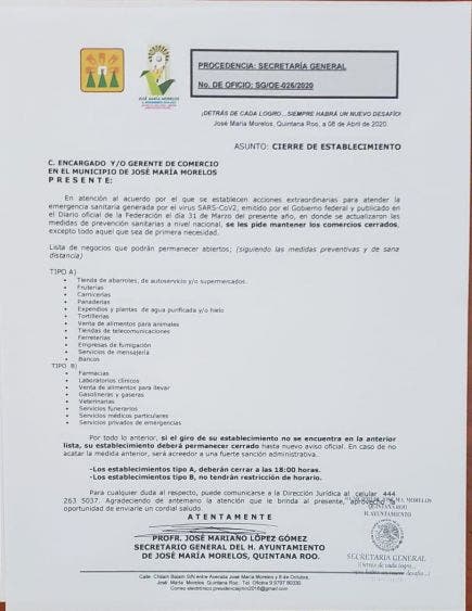 El Gobierno Municipal de José María Morelos, determinó a partir de este miércoles la suspensión de todas las actividades no esenciales, en apego al acuerdo por el que se establecen acciones extraordinarias para atender la emergencia sanitaria generada por el virus SarsCoV2 publicado en el Diario Oficial de la Federación el 31 de marzo de 2020 y ante el notable aumento de casos de la enfermedad COVID-19 en el estado de Quintana Roo.