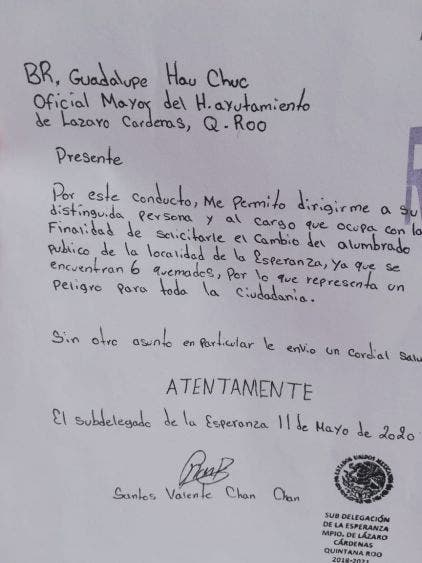 De acuerdo a una denuncia ciudadana, informativo turquesa acudió en la comunidad de La Esperanza donde entrevistó al subdelegado, Santos Valente Chan Chan, denunciando que han pasado más de un mes que solicitó el cambio de luminarias que se encuentran quemados desde en el mes de mayo y hasta la fecha no hay una respuesta favorable.