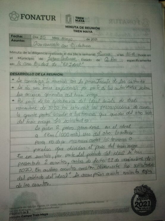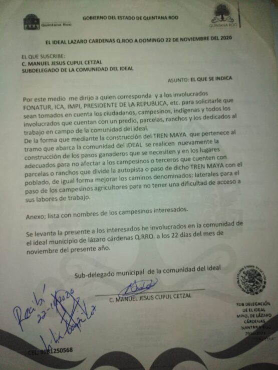 El documento avalado y firmado por los campesinos va dirigido a las autoridades de ICA, Fonatur, INPI y Gobierno de la República, con la finalidad de realizar caminos laterales para el paso hacia sus trabajaderos.