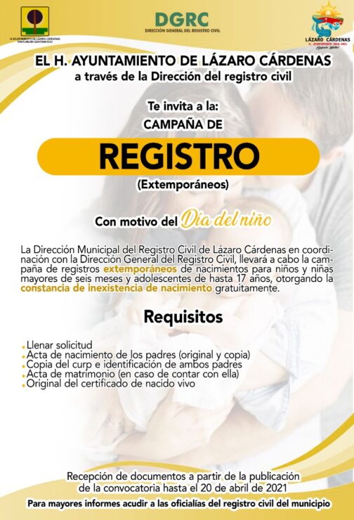 La Oficialía del Registro Civil del Ayuntamiento de Lázaro Cárdenas pondrá en marcha una campaña para apoyar a las actividades del Día del Niño, que busca brindar certeza jurídica a los infantes.