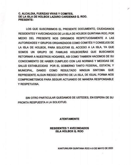 Y es que el documento va dirigido a las autoridades de la alcaldía y las fuerzas vivas de la isla de Holbox, ya que el temor de las familias de no permitir el ingreso de personas es por temor a ser contagiados por el Covid-19.
