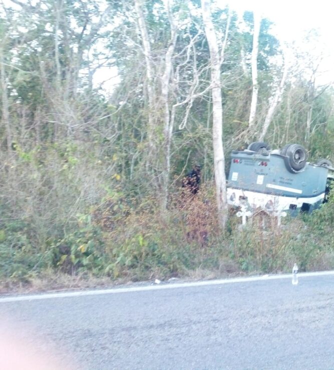 Vuelca camión de valores en la carretera Cancún-Mérida; los cuatro ocupantes resultaron lesionados y fueron trasladados a Cancún.
