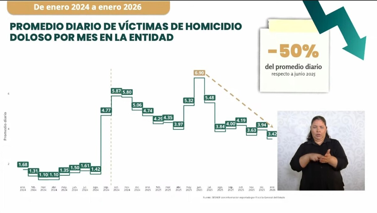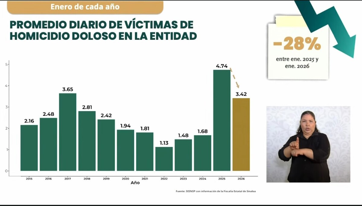 Por su parte, Marcela Figueroa Franco, titular de la Secretaría Ejecutiva del Sistema Nacional de Seguridad Pública, durante la Mañanera del Pueblo, presentó el reporte de incidencia delictiva en Sinaloa de enero de 2024 a enero de 2026, en el que señaló que el promedio diario de víctimas de homicidio, bajo de 6.90, junio de 2025, a 3.42 en enero de 2026, lo que representó una reducción del 50% en este delito.