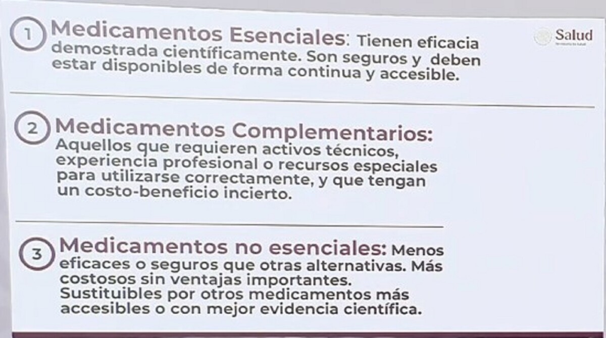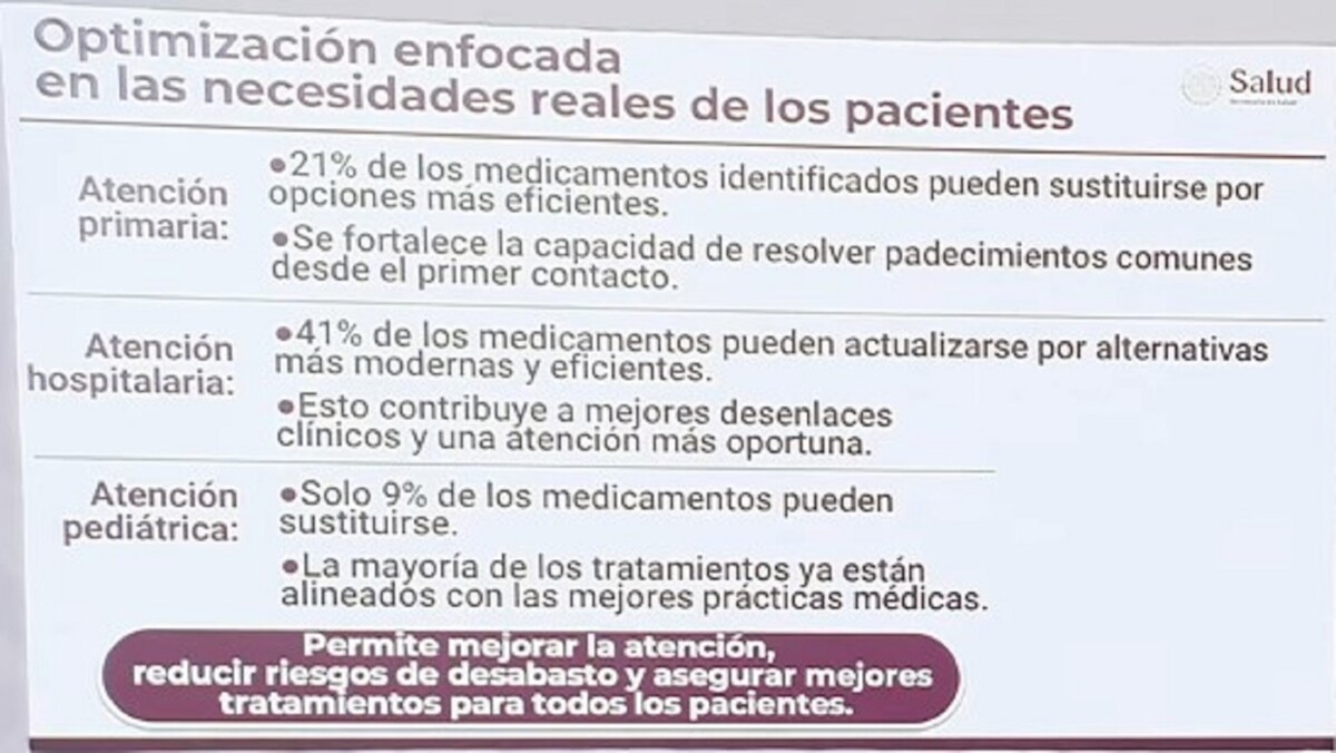 Agregó que se ha identificado que 21 por ciento de los fármacos pueden sustituirse en atención primaria por otros que tienen mayor eficacia, 41 por ciento de los medicamentos “pueden actualizarse por alternativas más modernas y más eficientes, y esto contribuye a mejores desenlaces clínicos y una atención clínica más oportuna”; y en la atención pediátrica, sólo 9 por ciento de los medicamentos pueden sustituirse porque la mayoría de los tratamientos ya están alineados con las mejores prácticas médicas.