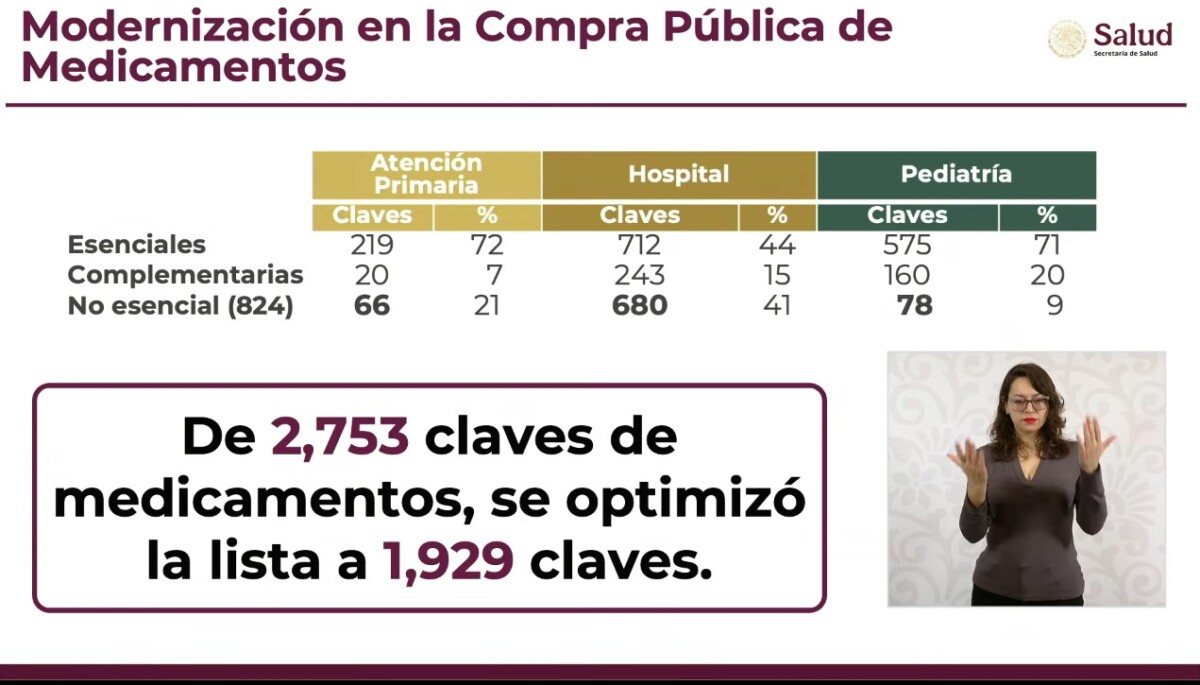 Detalló que de 2,753 claves de medicamentos que se tenían, a la fecha se ha optimizado la lista a 1,929 claves. Agregó que se ha identificado que 21% de los fármacos pueden sustituirse en atención primaria por otros que tienen mayor eficacia, y 41% de los medicamentos “pueden actualizarse por alternativas más modernas y eficientes.
