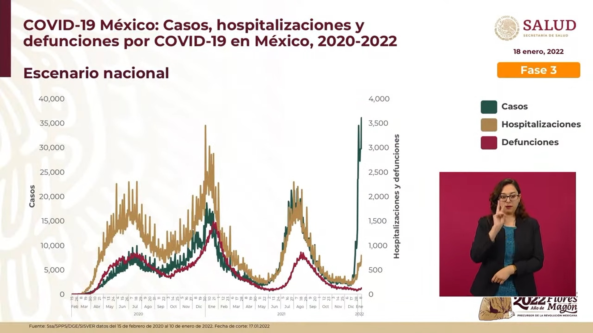 Durante esta mañana insistió en que la variante Ómicron ha resultado menos peligrosa, pues a pesar de que se transmite con mayor rapidez, en general los síntomas son leves, similares a los de otras enfermedades respiratorias y con una recuperación más rápida, por lo que hay menos hospitalizaciones. Destacó que, de las hospitalizaciones actuales, 65 % son personas sin vacunar o con el esquema incompleto.