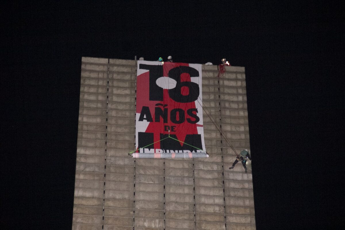 Dos integrantes del colectivo, quienes se prepararon previamente para ello, escalaron la Estela de Luz, de 104 metros de altura, cargando la manta de alrededor de 70 kilos que lograron desplegar horas después.