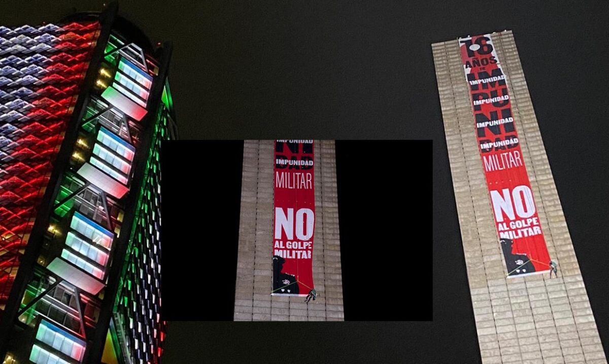En donde tras varias horas de ascenso, a las 2:30 de la mañana del viernes, a pocas horas del desfile, lograron desplegar una enorme lona que decía “16 años de impunidad militar. No al golpe militar”, Mensaje que finalizaba con la frase «Para cuándo nuestra independencia del Ejército”.