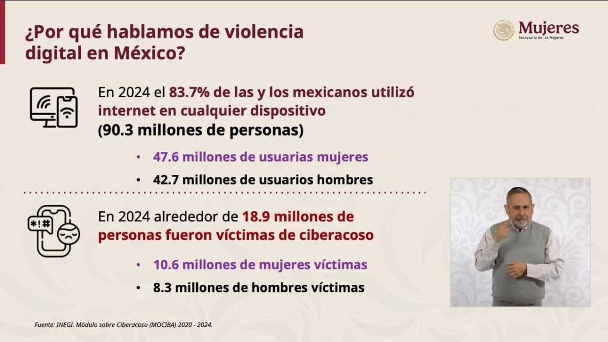 De acuerdo con el INEGI, en 2024 el 83.7% de las y los mexicanos utilizó internet en cualquier dispositivo (90.3 millones de personas, de los cuales 47.6 millones fueron mujeres y 42.7 hombres; al tiempo, alrededor de 18.9 millones de personas fueron víctimas de ciberacoso, de los cuales 10.6 millones de las víctimas fueron mujeres y 8.3 millones hombres.