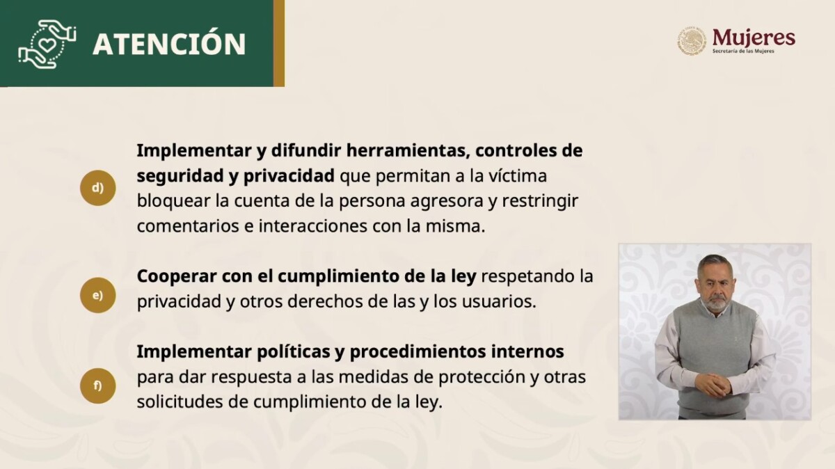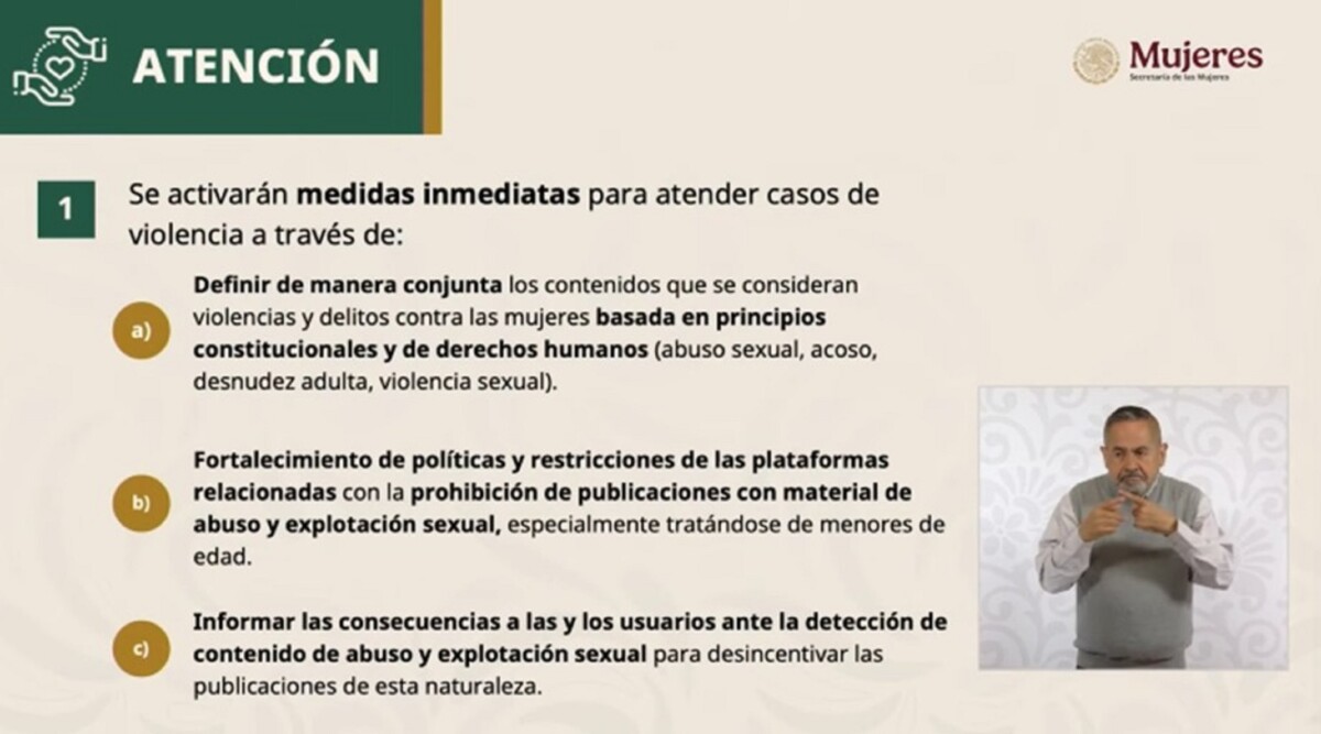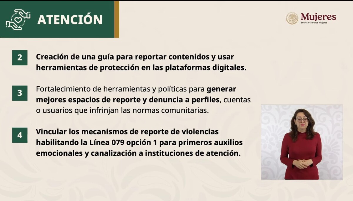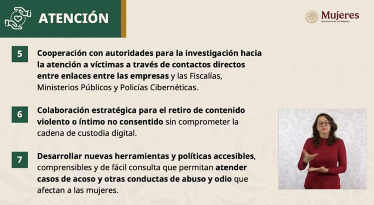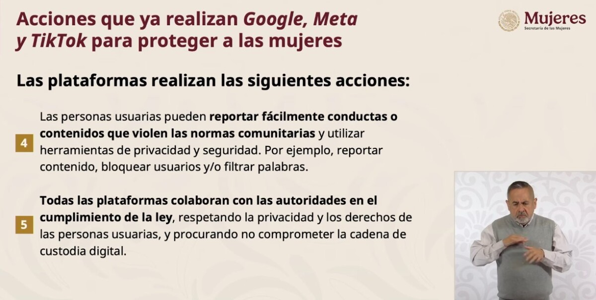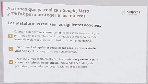 La secretaria informó que estas plataformas ya realizan acciones para proteger a las mujeres en el espacio digital, tales como normas comunitarias y reglas sobre lo que está y no permitido en las plataformas; guías especializadas para la prevención de violencias y el uso seguro de sus herramientas; herramientas y recursos para apoyar a víctimas de violencias; facilidad para que personas usuarias pueden reportar fácilmente conductas o contenidos que violen las normas comunitarias y utilizar herramientas de privacidad y seguridad así como la colaboración con las autoridades en el cumplimiento de la ley, respetando la privacidad y los derechos de las personas usuarias, y procurando no comprometer la cadena de custodia digital.