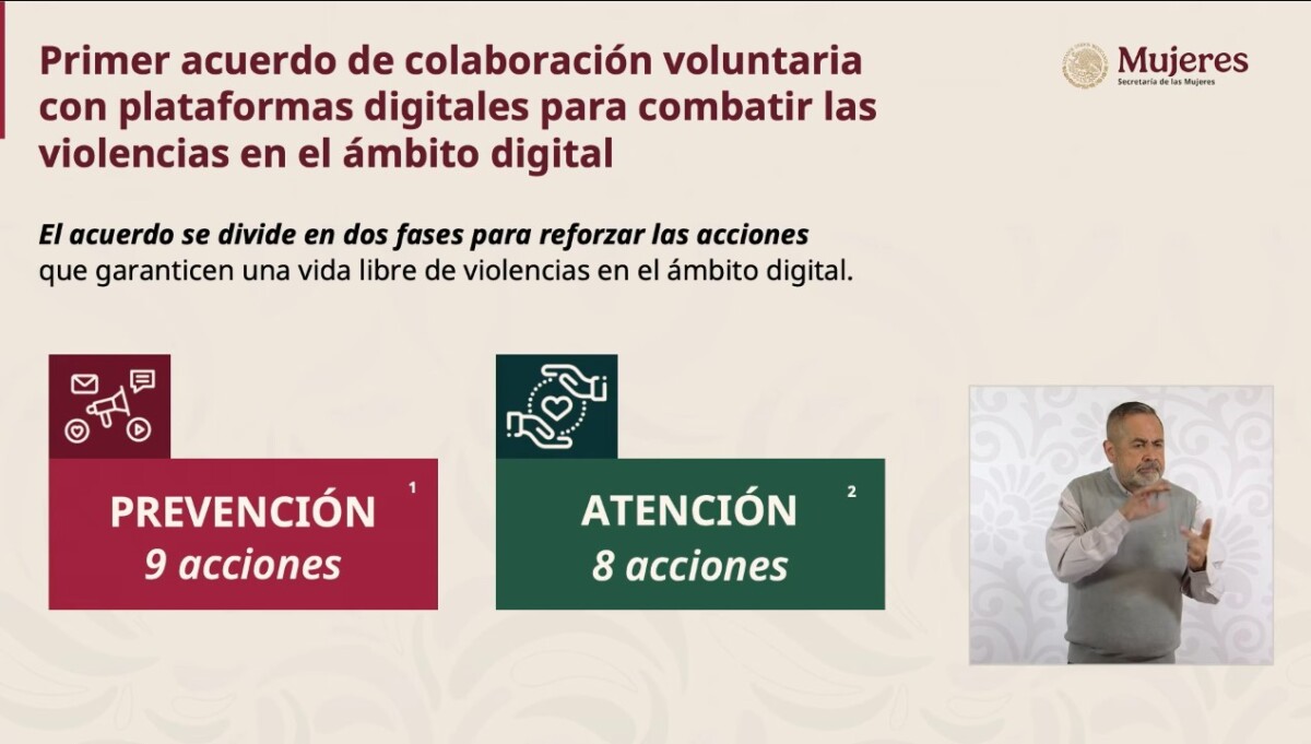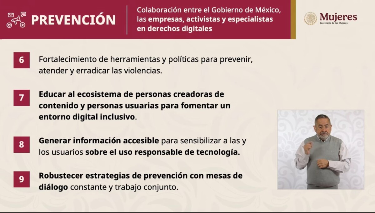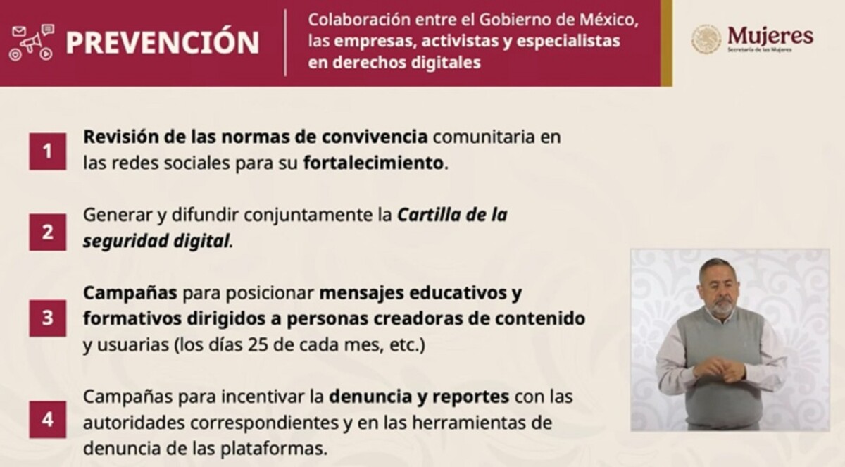 En la parte preventiva dijo que el acuerdo incluye: generar una cartilla de seguridad digital sobre los derechos de la mujer y las herramientas de denuncia porque hay poca cultura sobre la convivencia digital; las plataformas desarrollarán campañas para posicionar mensajes educativos generar una buena convivencia digital; los días 25 de cada mes se van a generar mensajes que alerten sobre este contenido de violencia digital.