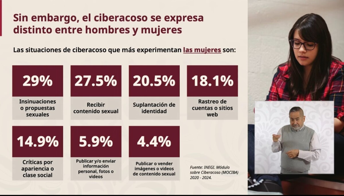 Sin embargo, la secretaria especificó que esta violencia se expresa de manera diferenciada por género ya que las situaciones de ciberacoso que más experimentan las mujeres son insinuaciones o propuestas sexuales (29%), recibir contenido sexual (27.5%), suplantación de identidad (20.5%), rastreo de cuentas o sitios web (18.1%, críticas por apariencia o clase social (14.9%), Publicar y/o enviar información personal, fotos o videos (5.9%), publicar o vender imágenes o videos de contenido sexual (4.4%).