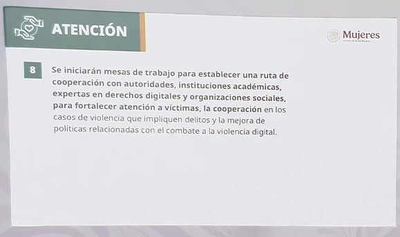 - Se iniciarán mesas de trabajo para establecer una ruta para fortalecer atención a víctimas, la cooperación en los casos de violencia que impliquen delitos y la mejora de políticas relacionadas con el combate a la violencia digital.