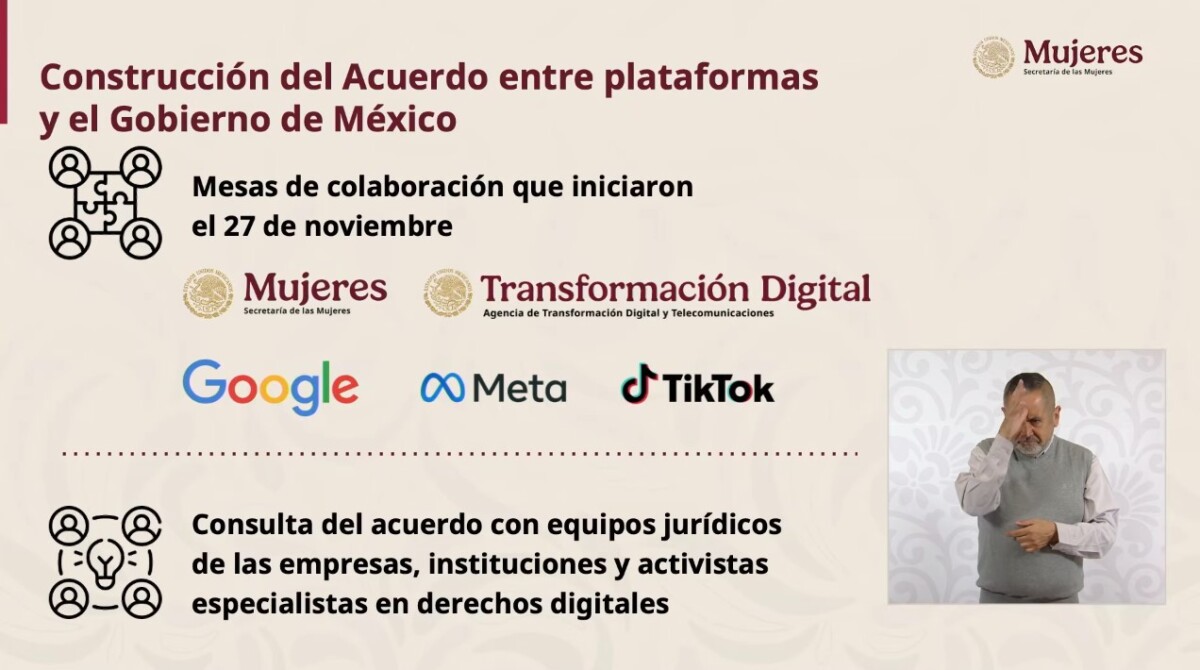 La secretaria de las Mujeres, Citlalli Hernández Mora, informó que este primer convenio es resultado de mesas de colaboración que iniciaron el 27 de noviembre de 2025 con Google, Meta y Tiktok y se divide en dos fases: prevención y atención.