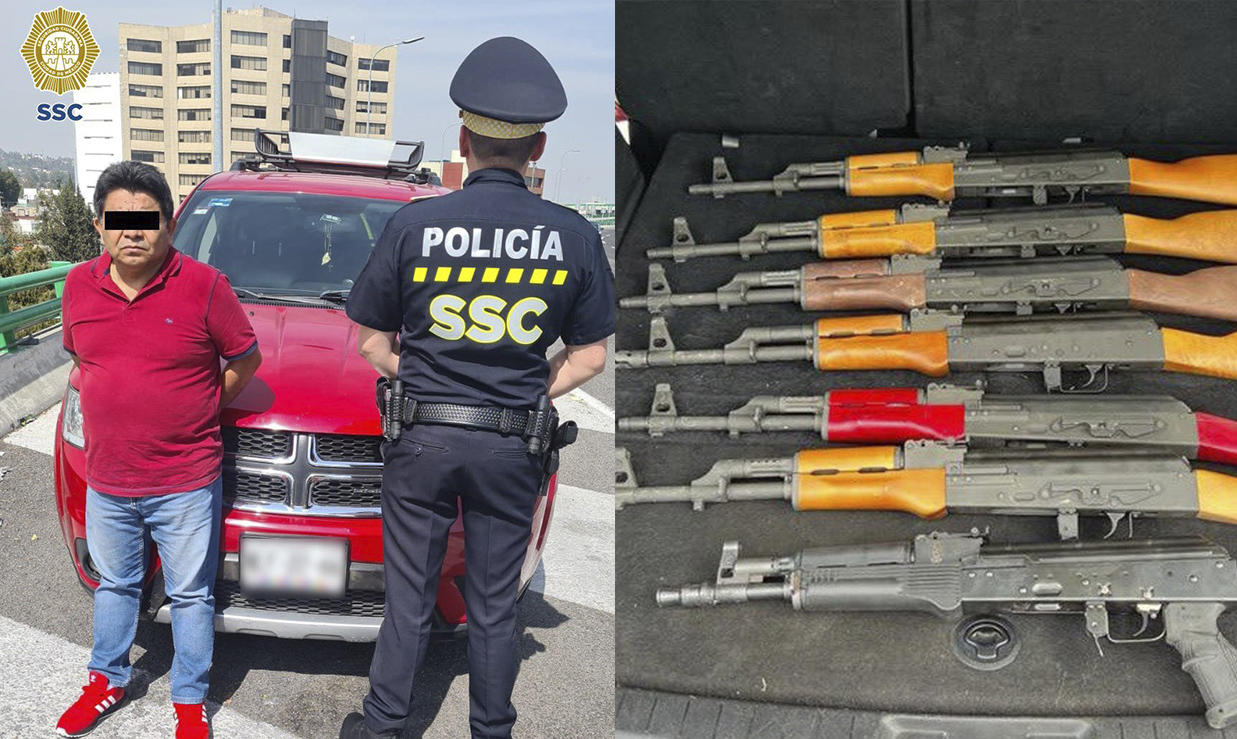 Y es que el secretario de la SSC_CdMx, explicó que el presunto contrabandista de armas fue detenido por policías de la Subsecretaría de Control de Tránsito, al hallar siete armas de fuego largas –AK47-, cartuchos útiles y droga al interior de su vehículo.