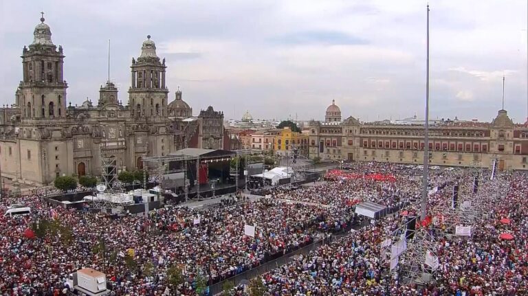 Vista general tomada con drone, donde se observan a miles de asistentes a la Plaza de la Constitución, en el zócalo de la Ciudad de México.