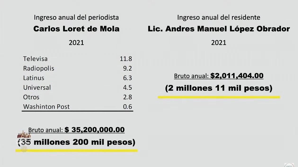 Apenas el viernes pasado, dio a conocer que Loret de Mola supuestamente recibe más de 35 millones de pesos al año (más de 1.7 millones de dólares) como ingresos, lo que generó un debate en redes sociales por la vulneración de sus datos personales.