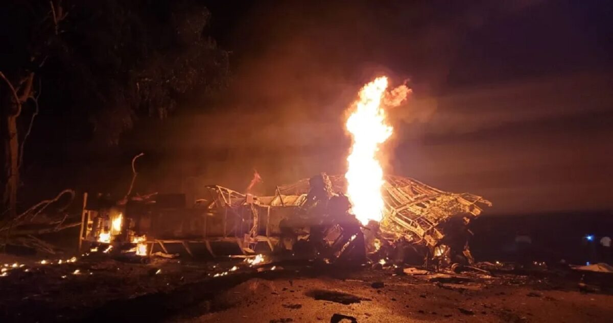 La Guardia Nacional informó que la colisión ocurrió la madrugada de este sábado, a la altura del kilómetro 67, debido a que se desprendió un autotanque de la pipa que transportaba 33 mil litros de gasolina y que impactó contra el camión, el cual se incendió.