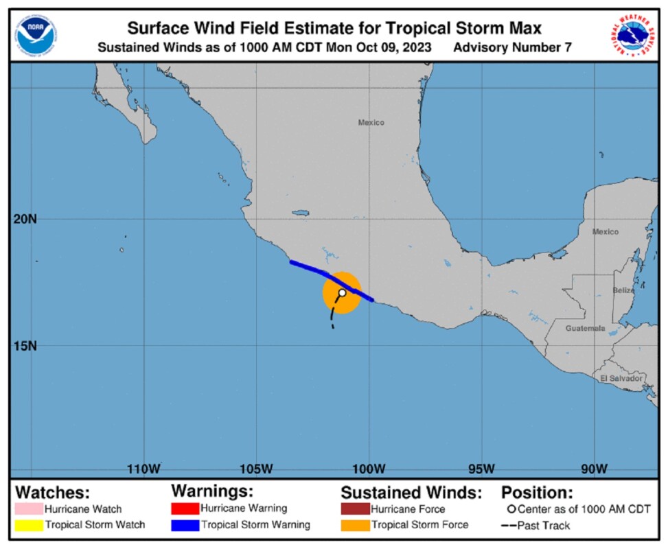 De acuerdo con el SMN, se espera que la tormenta tropical Max haga contacto por primera vez en suelo nacional este mismo lunes 9 de octubre, en línea de costa, aproximadamente a 20 kilómetros al sureste de Zihuatanejo, Guerrero, aproximadamente a las 12:00 horas (tiempo Centro de México).