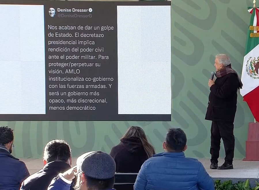Por su parte el presidente Andrés Manuel López Obrador leyó el tuit de la politóloga Denise Dresser, quien aseguró que con el acuerdo presidencial por el que se declaran de seguridad nacional todas sus obras, se dio un “golpe de Estado”.