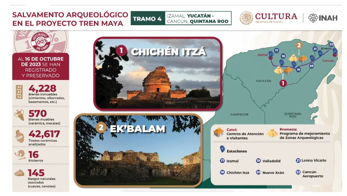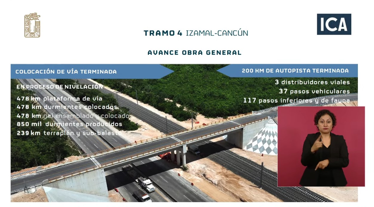 Al presentar los avances del proyecto, en particular el Tramo 4 —el que mayor adelanto tiene—, el general Óscar David Lozano Águila, director general de la empresa Tren Maya, dependiente de la Secretaría de la Defensa Nacional, señaló que en este trayecto que corre de Izamal a Cancún se tiene un 100 por ciento de avance en la vía terminada.