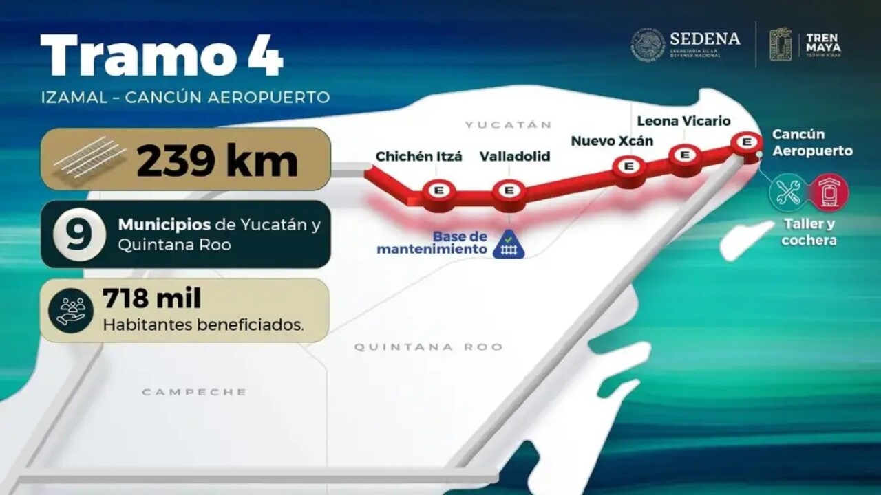 El tramo 4 del Tren Maya que consta de cinco estaciones y que va de Izamal a Cancún beneficia a 718 mil habitantes de la región de acuerdo con el Instituto Nacional de Estadística y Geografía (INEGI).