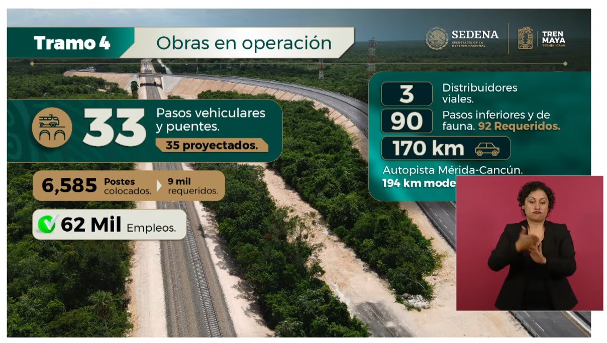 Las obras complementarias al tramo 4 del Tren Maya incluyen 35 pasos vehiculares de los cuales 33 ya fueron concluidos, también se están modernizando 194 kilómetros de la autopista Mérida-Cancún, de los que 170 km ya fueron entregados y con ello se generaron 62 mil empleos.