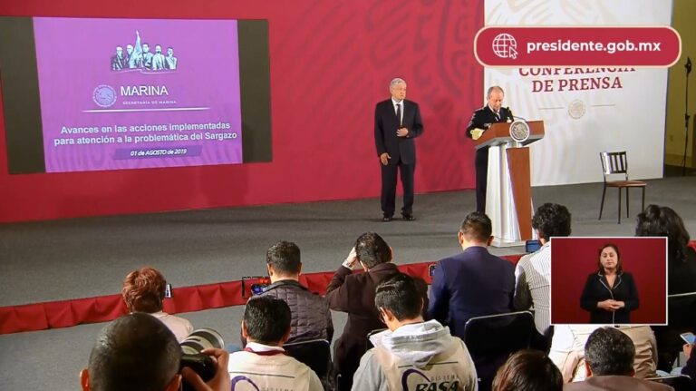 En conferencia en Palacio Nacional, el funcionario federal informó que se han realizado distintas tareas para combatir el sargazo tanto en tierra como en altamar, lo que ha dado como resultado la recolección de 57 mil 603.11 toneladas de alga entre mayo y julio.