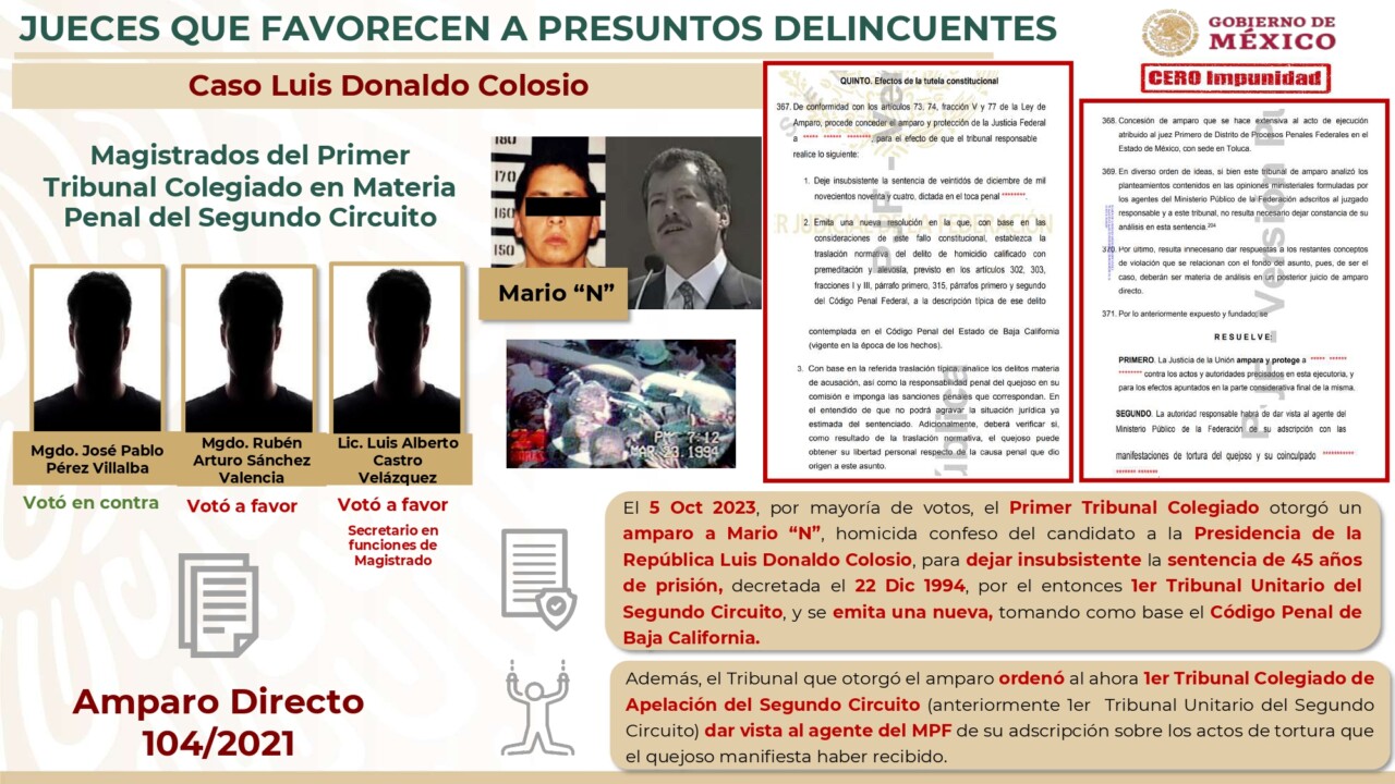 Como parte de la estrategia Cero Impunidad del Gobierno Federal, en la sección de jueces que favorecen delincuentes, se presentaron dos casos en donde se otorgó un amparo indirecto a Tomás “N” prófugo de la justicia vinculado al caso Ayotzinapa y un amparo a Mario “N”, homicida confeso del candidato a la Presidencia de la República, Luis Donaldo Colosio.