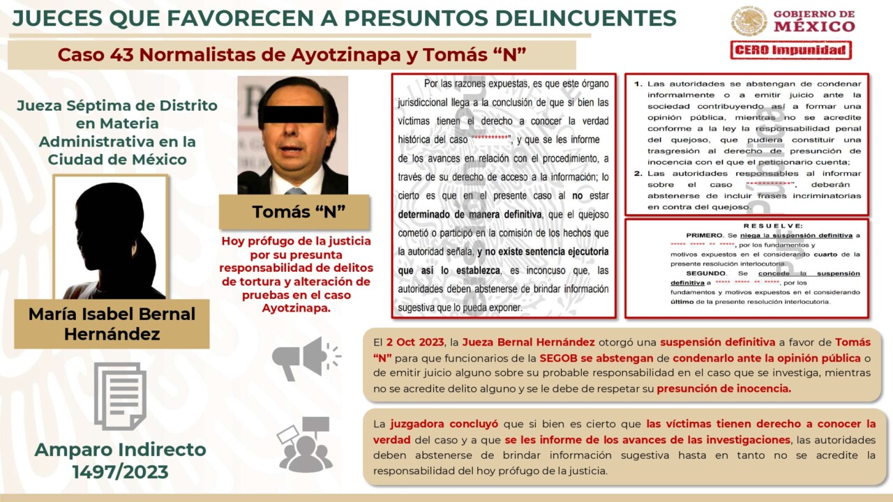 En el primer caso, la jueza María Isabel Bernal Hernández otorgó el 2 de octubre del presente año una suspensión definitiva a favor de Tomás “N” para que funcionarios de la Secretaría de Gobernación (Segob) se abstuvieran de condenarlo ante la opinión pública por su presunta responsabilidad de delitos de tortura y alteración de pruebas en el caso Ayotzinapa.