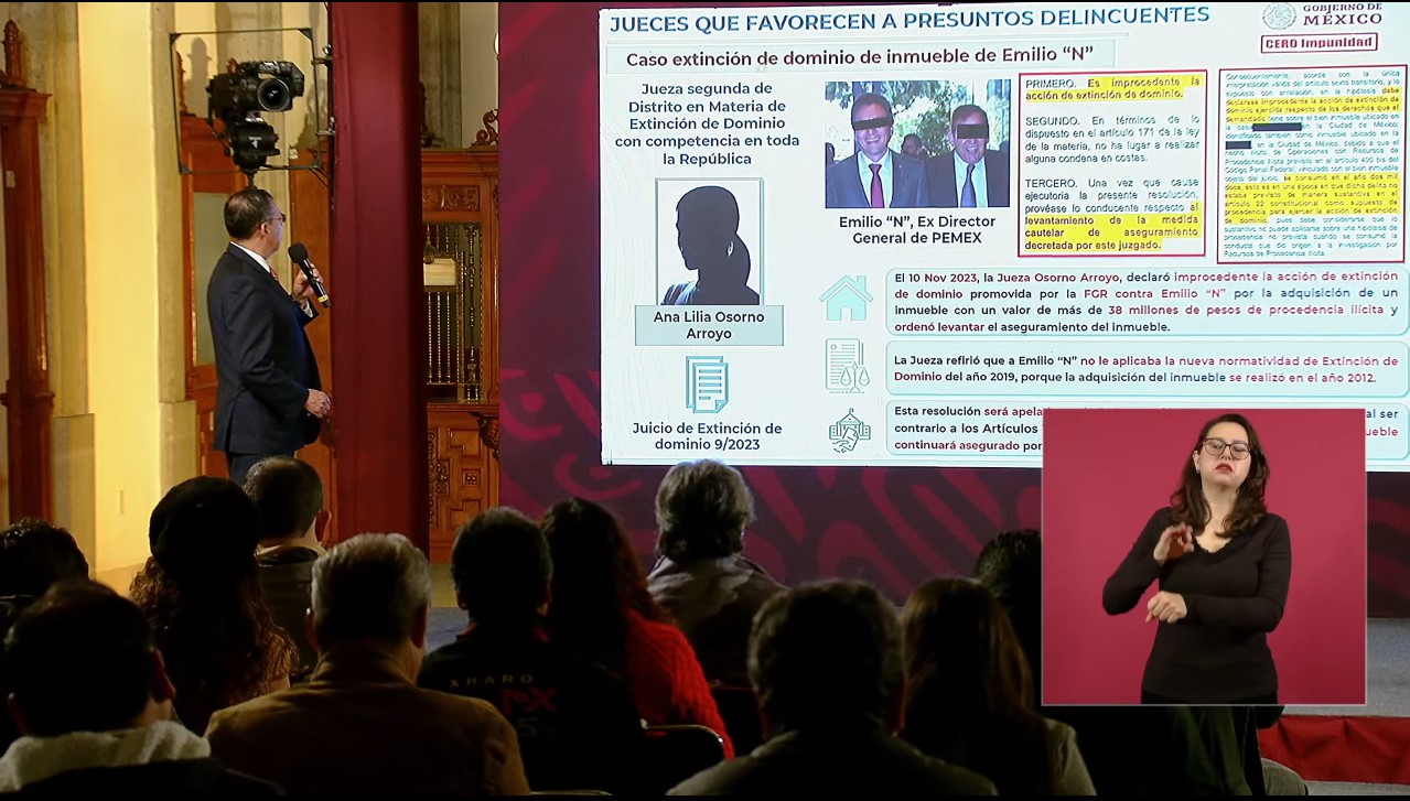Rodríguez Bucio se refirió también a la juez Ana Lilia Osorno Arroyo, quien determinó que es improcedente la acción de extinción de dominio que la Fiscalía General de la República (FGR) pretendía realizar contra la residencia del ex director de Petróleos Mexicanos (Pemex), Emilio Lozoya, ubicada en el poniente de la Ciudad de México, valuada en 38 millones de pesos.