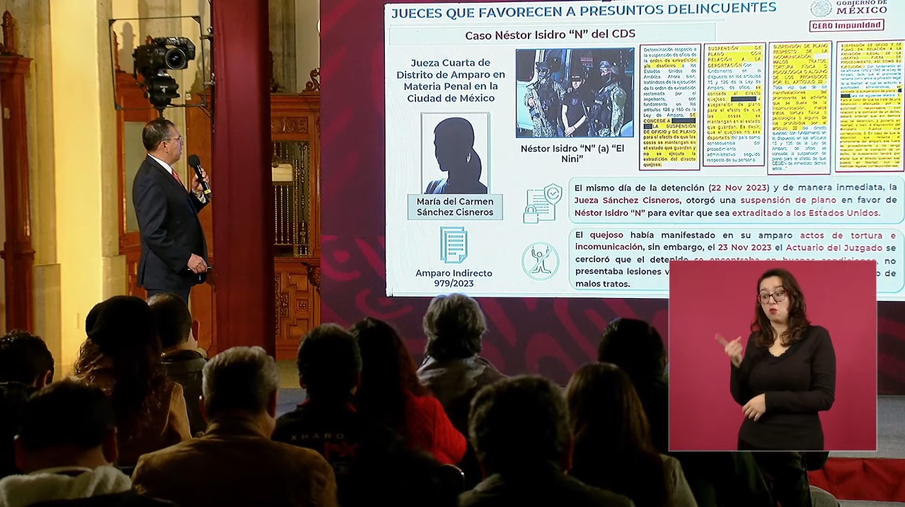 Por último, el funcionario exhibió a la juez Cuarta de Distrito de Amparo en Materia Penal en la Ciudad de México, María del Carmen Sánchez Cisneros, quien otorgó un amparo a Néstor Isidro Pérez Salas, alias El Nini, para frenar su extradición a Estados Unidos.