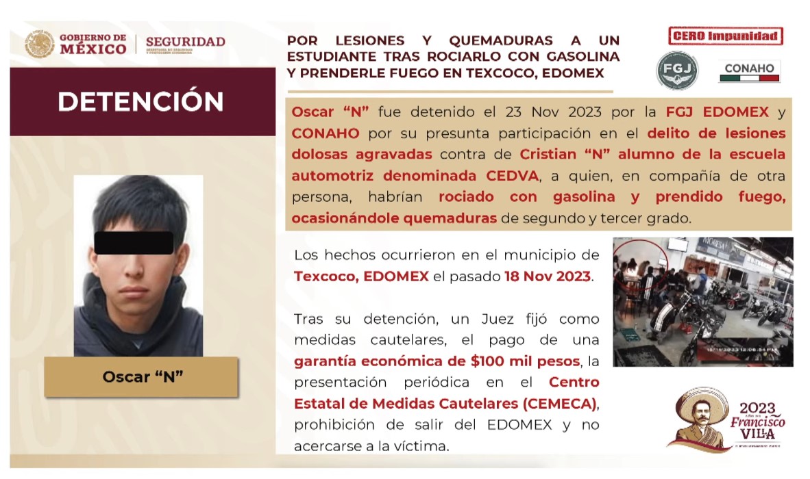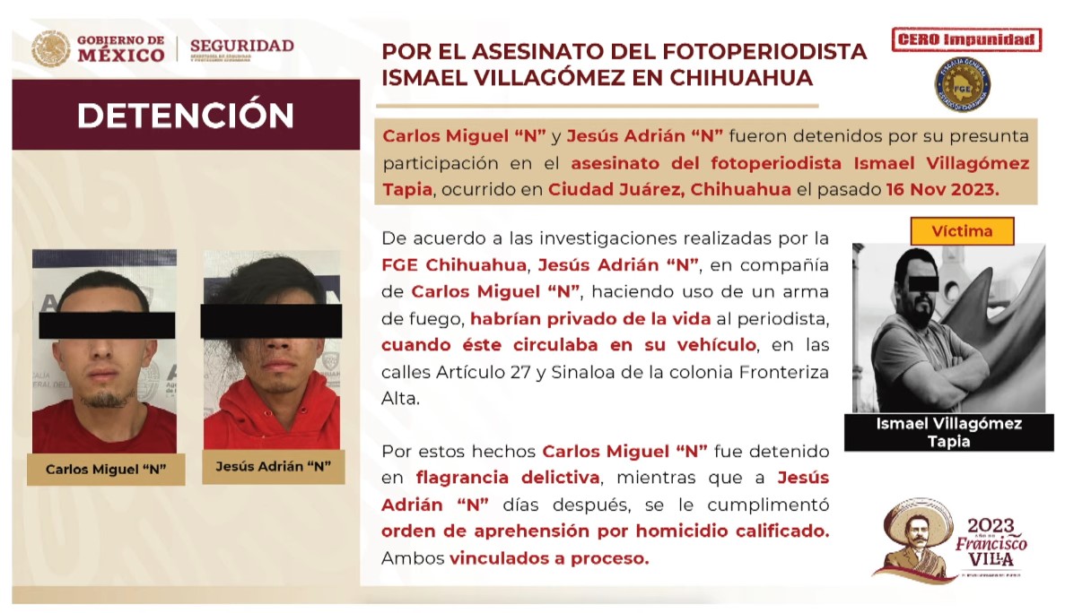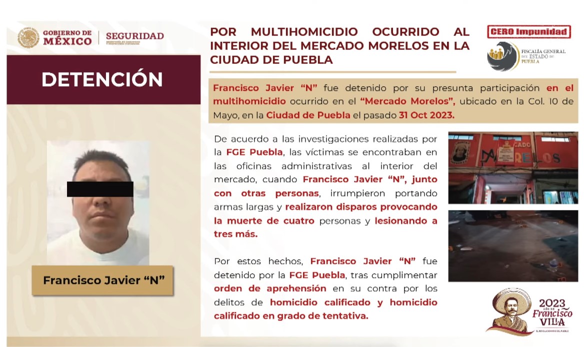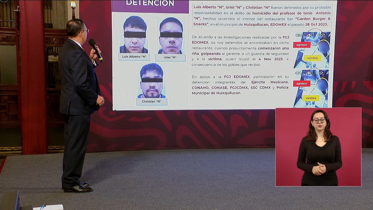 Además, en la conferencia matutina se informó sobre la detención de Juan Carlos “N”, presunto jefe de plaza del cártel Jalisco Nueva Generación (CJNG); de Francisco Javier “N”, por su presunta participación en el multihomicidio ocurrido en el Mercado Morelos de Puebla; Genaro “N” sentenciado a 50 años de prisión tras acreditar su responsabilidad en el delito de violación en agravio de una menor de edad en Lázaro Cárdenas, Quintana Roo, en 2019; la detención de Carlos Miguel “N” y Jesús Adrián “N” por su presunta participación en el asesinato de un fotoperiodista Ismael Villagómez Tapia, ocurrido en Ciudad Juárez el 16 de noviembre de 2023, entre otras detenciones.