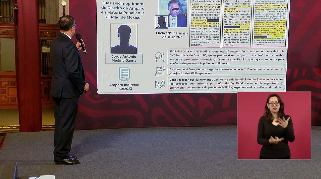 En la conferencia de prensa matutina del presidente Andrés Manuel López Obrador, celebrada en Palacio Nacional, Rodríguez Bucio señaló en primer lugar al juez Décimo de Amparo en Materia Penal de la Ciudad de México, Jorge Antonio Medina Gaona, quien otorgó un amparo a Lucía Collado, hermana de Juan Collado, quien fuera abogado de confianza del ex presidente Enrique Peña Nieto y quien enfrenta procesos penales acusado de delincuencia organizada, lavado de dinero y defraudación fiscal.