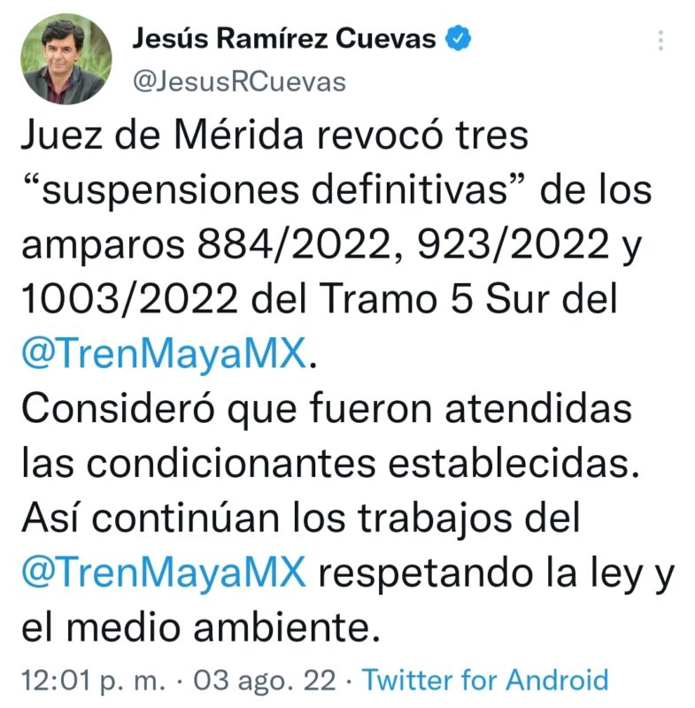 Por medio de redes sociales, expuso: “Juez de Mérida revocó tres “suspensiones definitivas” de los amparos 884/2022, 923/2022 y 1003/2022 del Tramo 5 Sur del @TrenMayaMX. Consideró que fueron atendidas las condicionantes establecidas. Así continúan los trabajos del @TrenMayaMX respetando la ley y el medio ambiente».