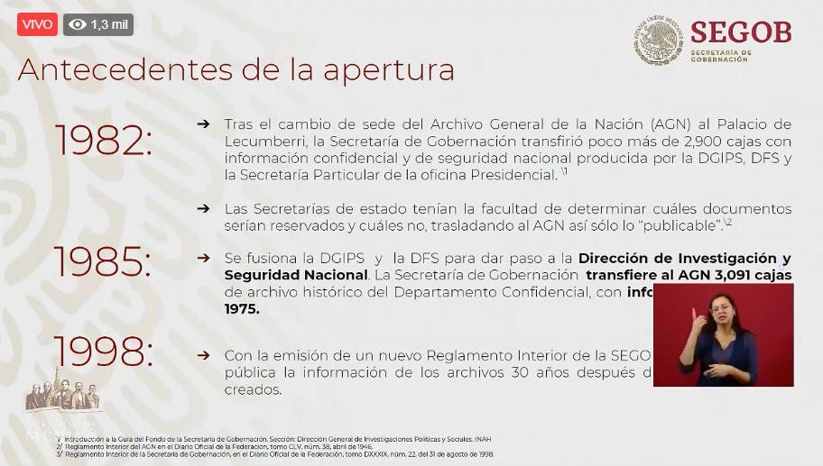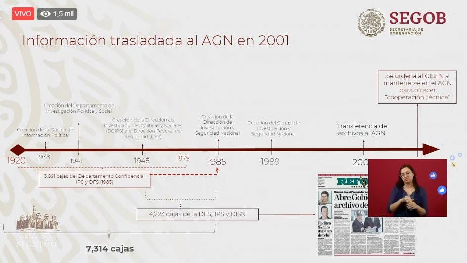 El Subsecretario de Gobernación, Zoé Robledo Aburto, informó que la conformación de estos documentos data de hace muchos años y es parte de un acervo histórico de la Nación, prácticamente desde 1918 –en la época del Presidente Venustiano Carranza–, hasta llegar a la creación de la Dirección Federal de Seguridad, surgida en 1948, y el Cisen desde 1989.