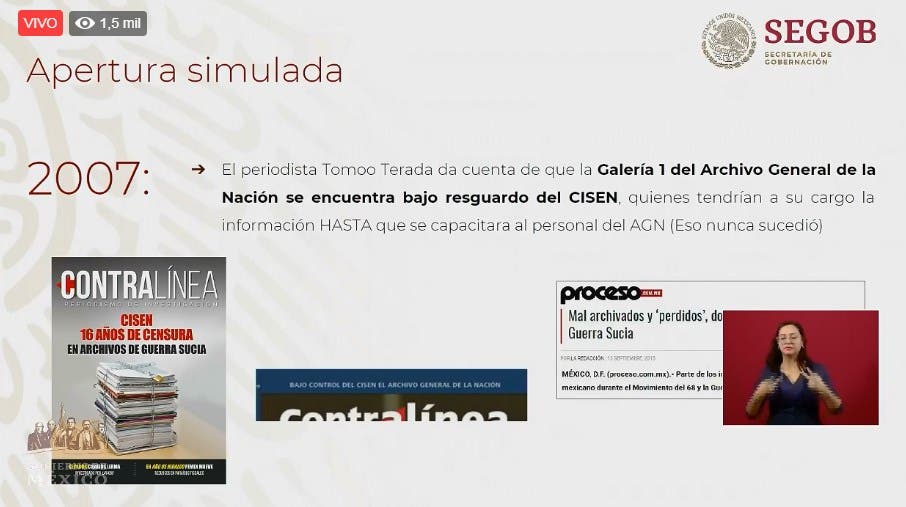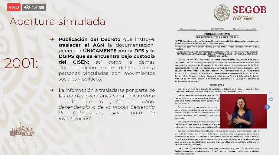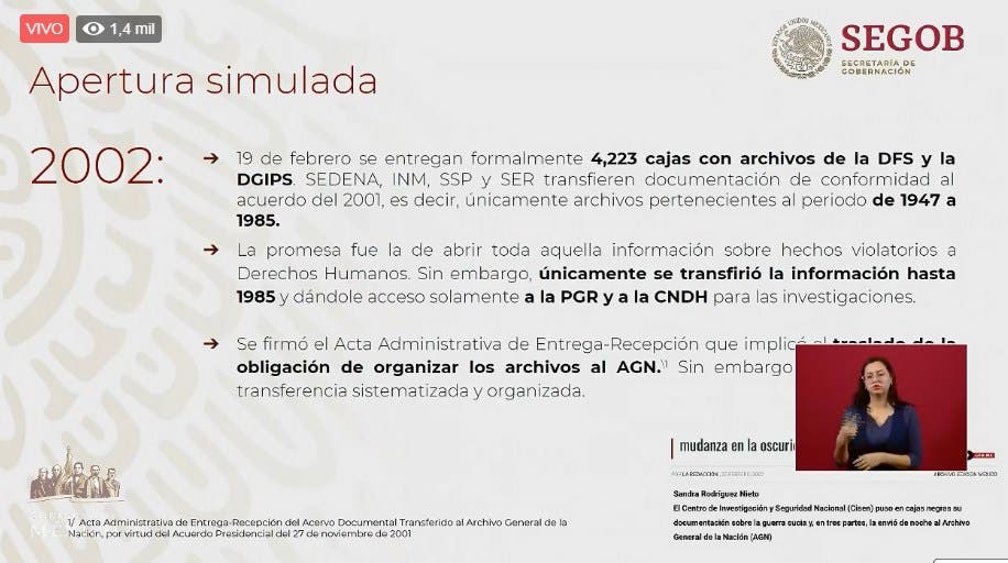 En 2001 se habló de que habría una apertura de documentos de movimientos políticos y sociales, en específico de 1968. Sin embargo se hizo una entrega “simulada” el 19 de febrero de 2002, que no tenía información del Cisen. Entregaron 4 mil 223 cajas de archivos de la DFS y la DGIPS.