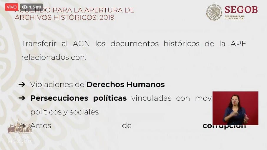 Ayer, el Gobierno federal publicó en el Diario Oficial de la Federación (DOF) el acuerdo por el cual se instruye a todas las dependencias, incluidos los órganos desconcertados, a transferir la totalidad de documentos relacionados con “violaciones de derechos humanos y persecuciones políticas vinculadas con movimientos políticos y sociales, así como actos de corrupción” al Archivo General de la Nación (AGN).