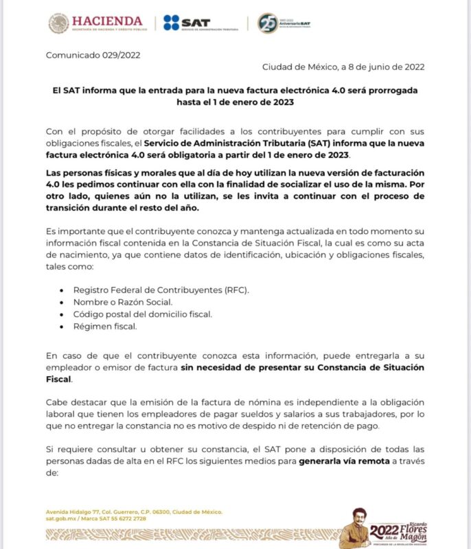 El Servicio de Administración Tributario (SAT) informó que la entrada en vigor del Comprobante Fiscal Digital por Internet (CFDI) 4.0 será el primero de enero del 2023, en lugar del primero de julio de 2022.