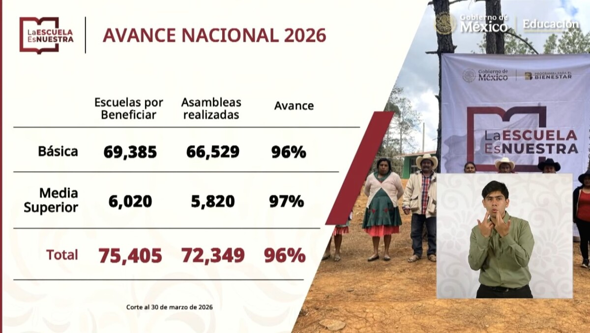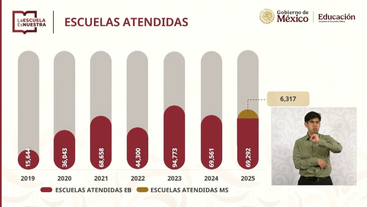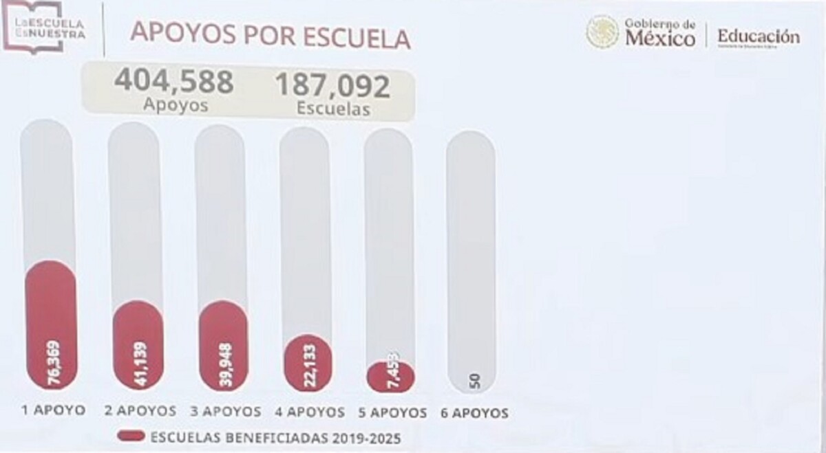 Además, destacó que el programa alcanzará en 2026 una cobertura total en secundarias y nivel medio superior, y que los planteles podrán recibir recursos hasta en tres ocasiones durante el sexenio. Indicó que, desde su creación en 2019, se han entregado más de 404 mil apoyos a cerca de 187 mil escuelas, con una inversión acumulada de 142 mil 500 millones de pesos.